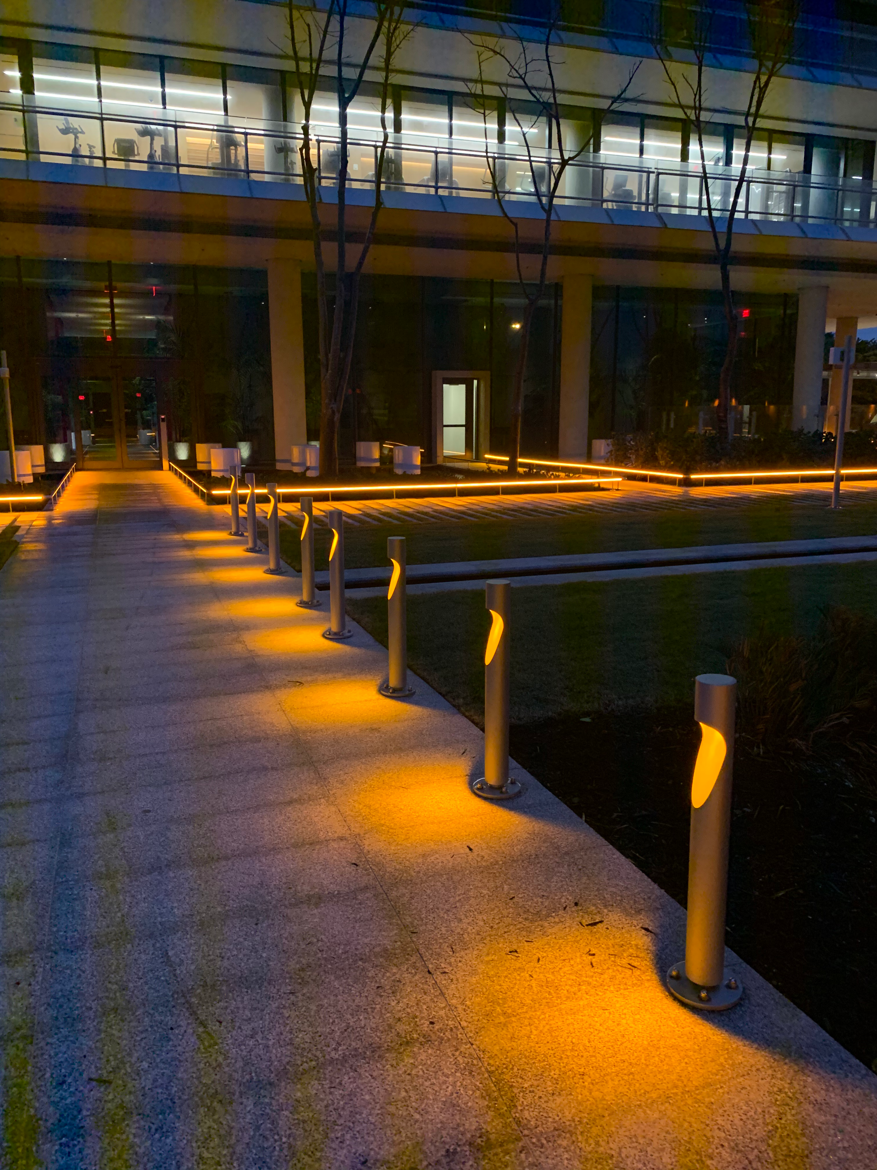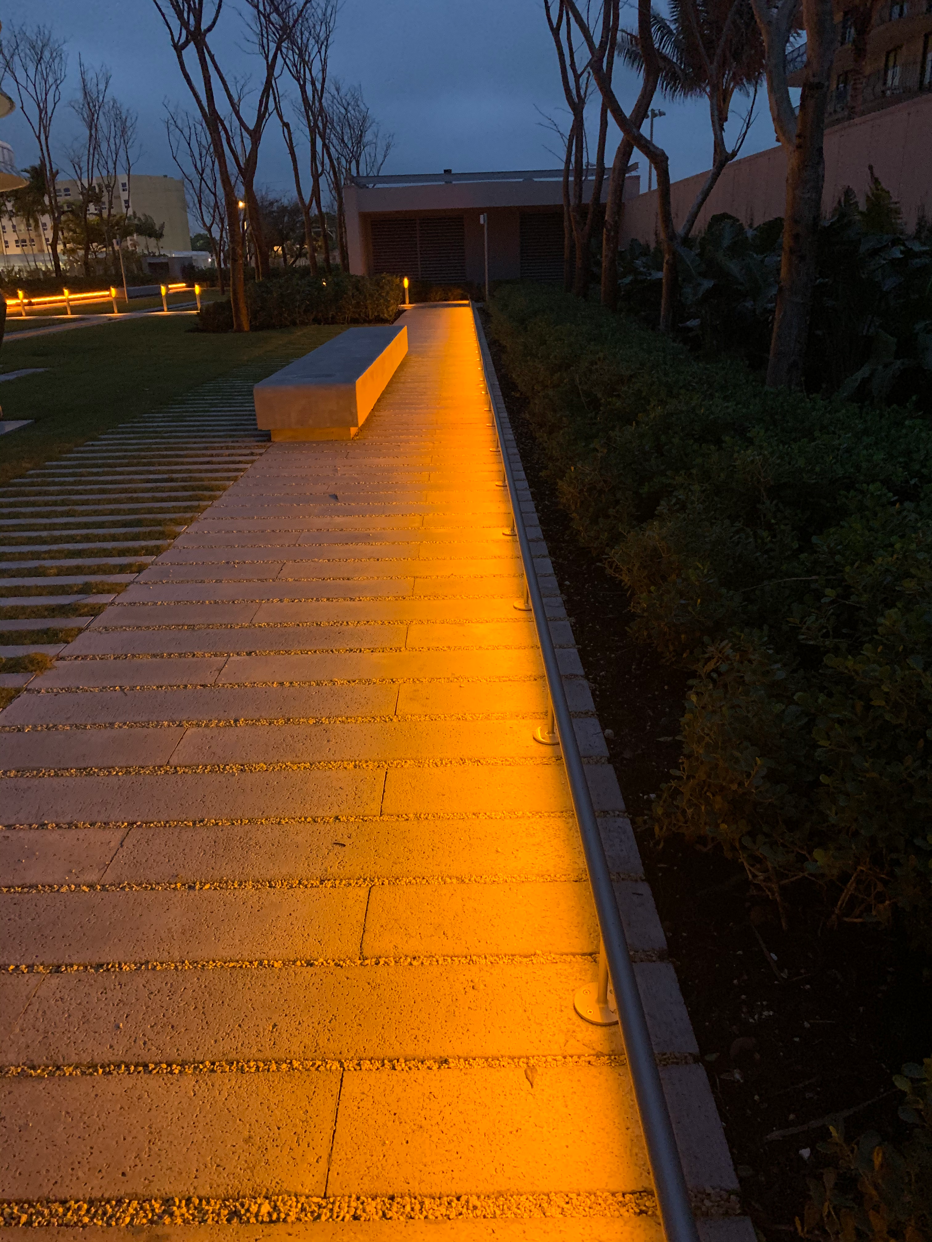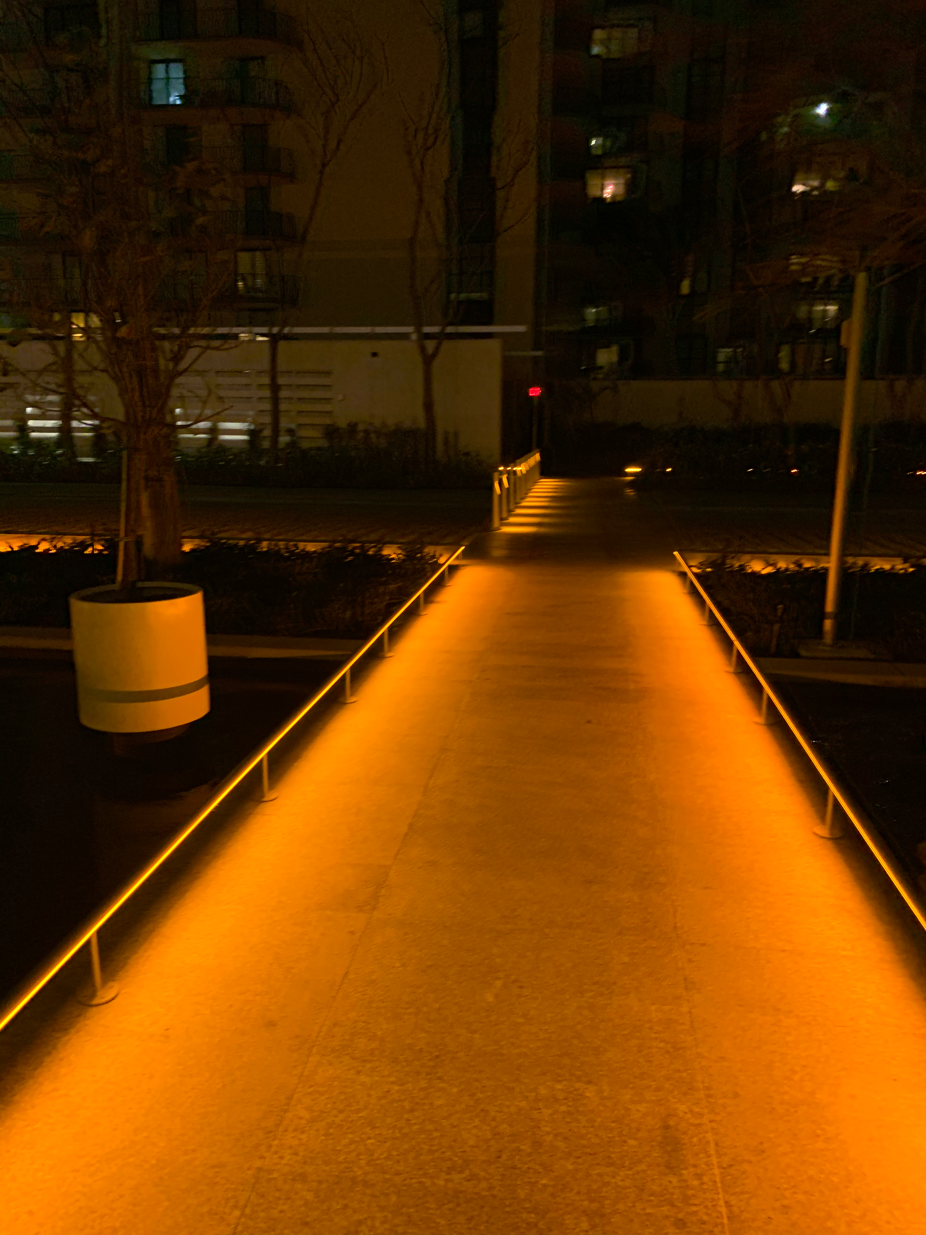 - Outdoor walkway with warm orange lighting at night