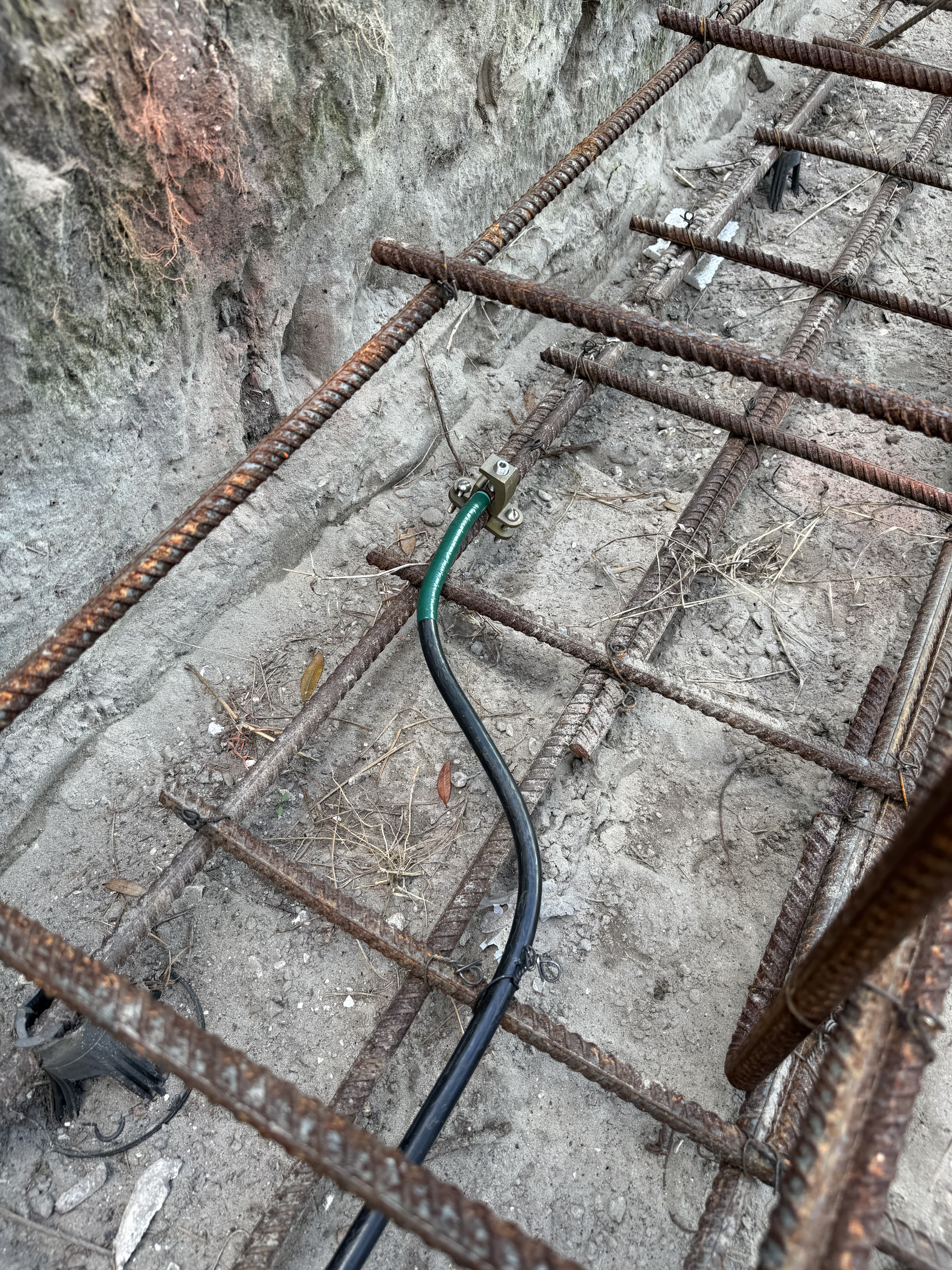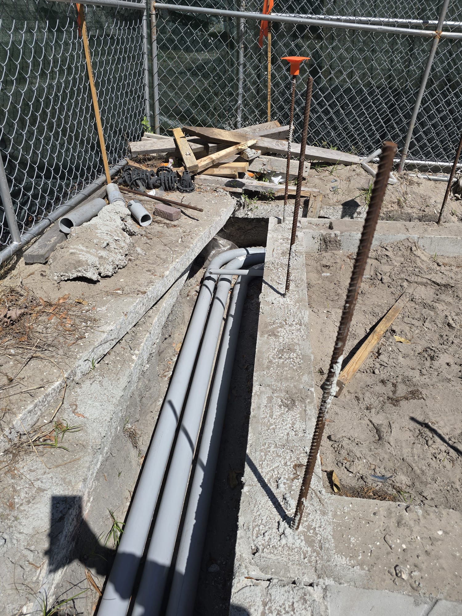 - Electrical conduit installation with rebar in a Florida trench.