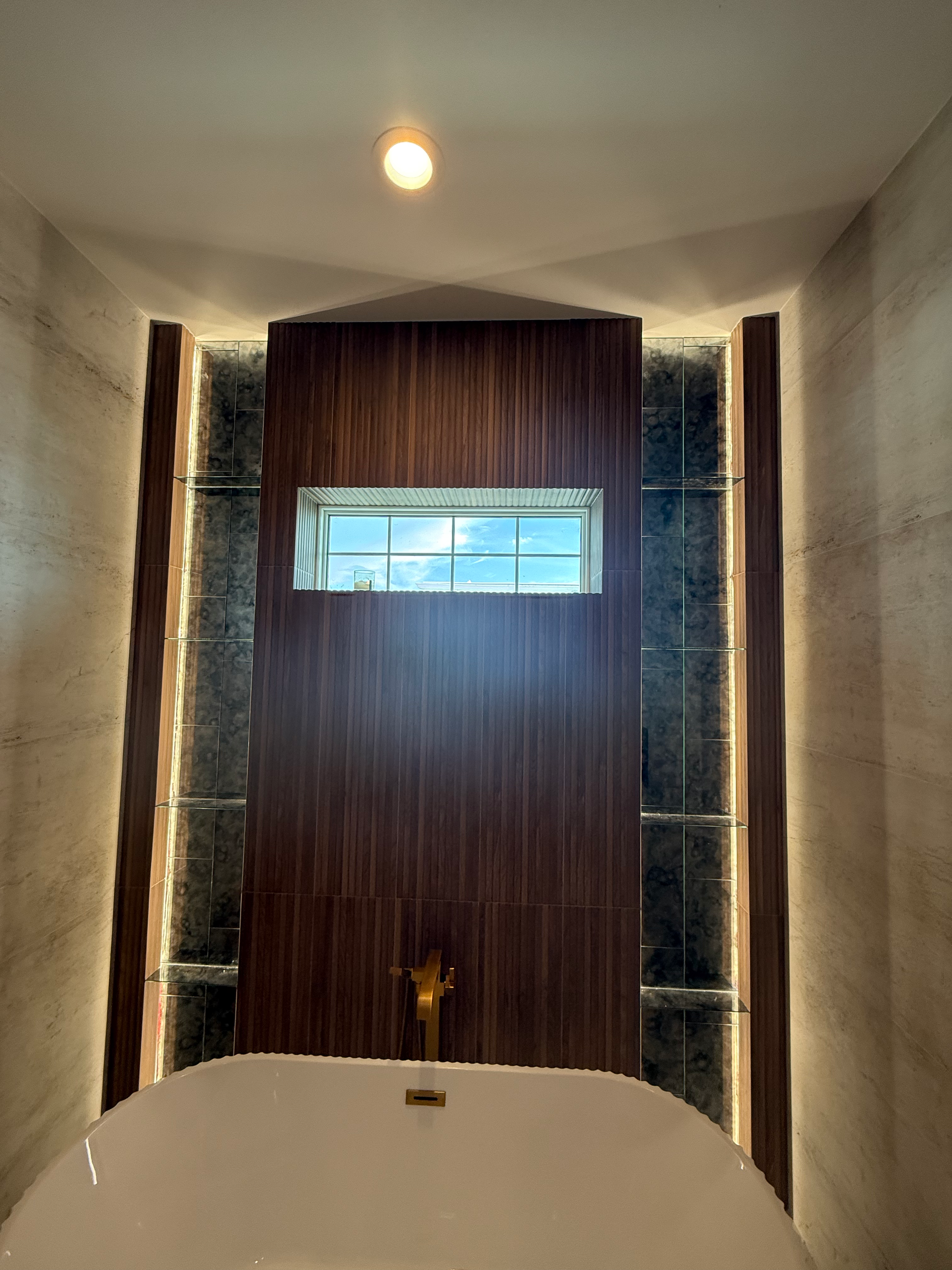 - Modern bathroom with integrated lighting, wood paneling, and glass shelves