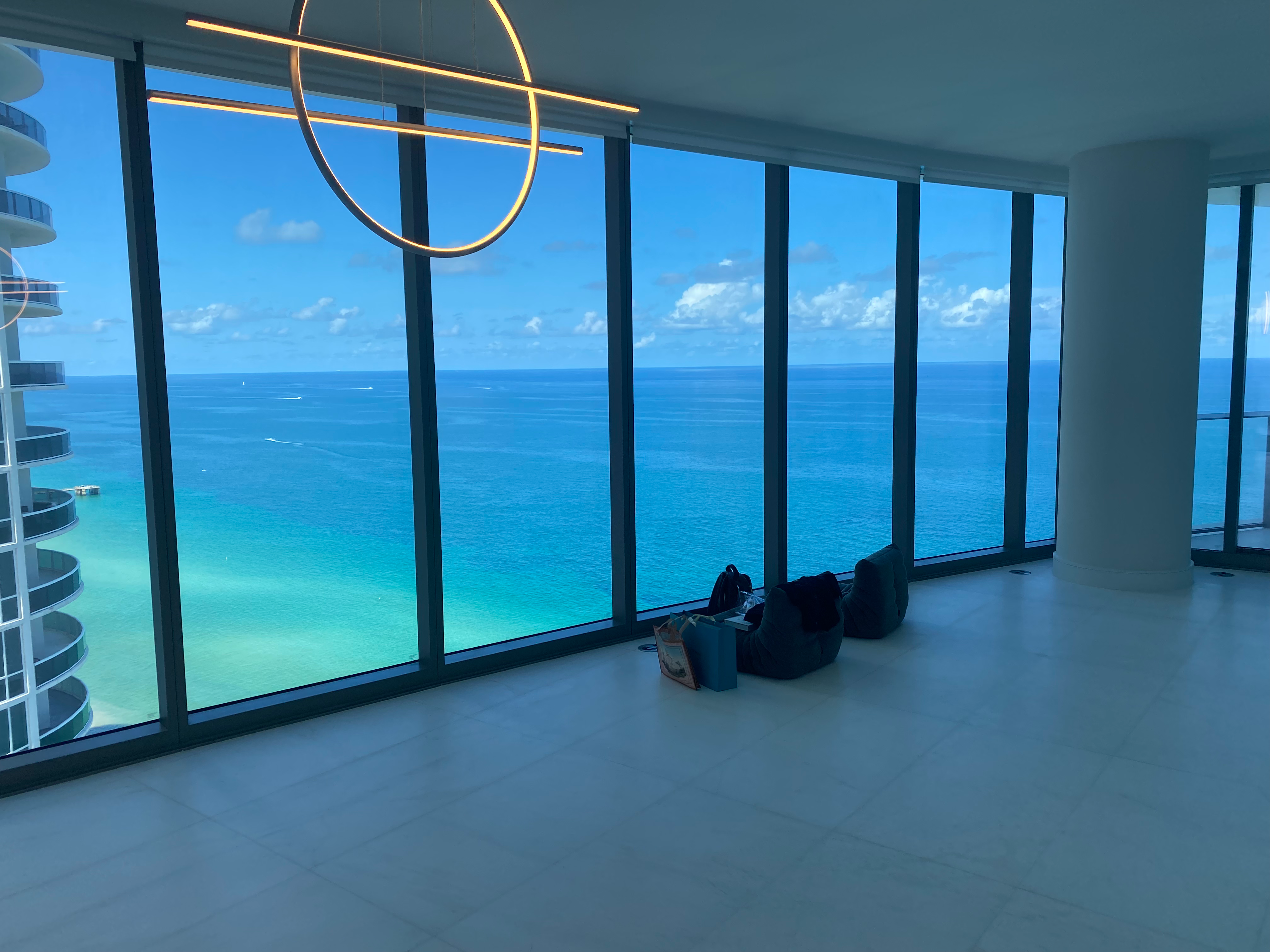 - Room with panoramic ocean view and modern ceiling light